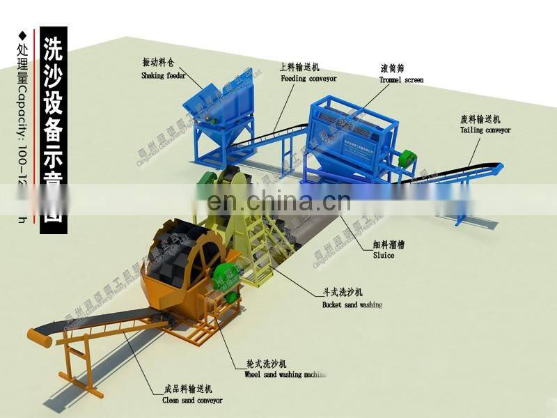 The small one getting into the material tank through sluice and the first cleaning is carried out through the bucket type sand washing machine, and then the second time washing by sand washing machine,finally the clean sand transported by conveyor.