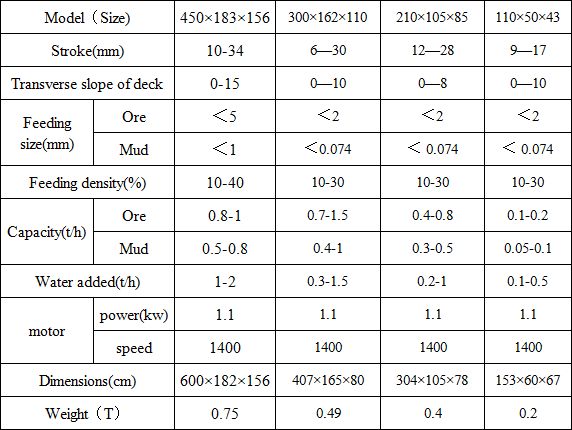Separating precisely is the prominent advantage of shaking table. We can get some final concentrate, final tailings and 1 or 2 kinds of middling product after the first separating from raw mineral. The enrichment ratio of concentrate is very good, when dealing with low grade tungsten ore and tin ore, the enrichment ratio could reach about 300 times. Besides, the range of separating particle size effectively in dealing with metallic ore is 3 to 0.02 mm.