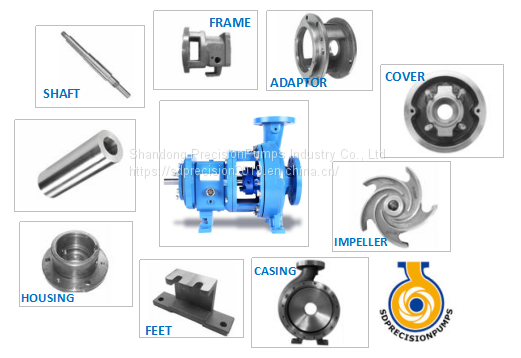 3. Pump parts include impeller, casing, cover, frames, bearing housing, adaptor, shaft & sleeves, feet.