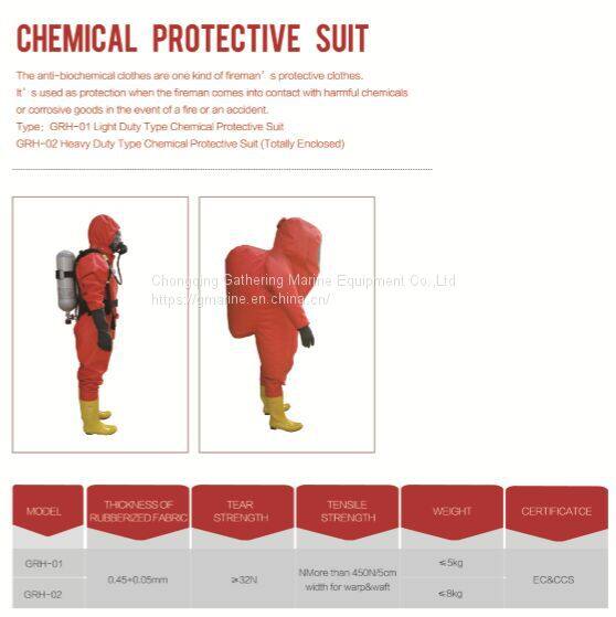 The anti-biochemical are one kind of fireman’s protective clothes. It’s used as protection when the fireman comes into contact with harmful chemicals or corrosive goods in the event of a fire or accident. The Thickness of rubberized fabric are 0.45 +0.05mm and the weight of whole clothes are no more than 8KG. The tensile strength are 4450N/5cm width for warp and waft. The tear strength are no less than 32N. Our products are SOLAS compliant, approved by the administrations of contracting governments, and certified in accordance with CCS and EC.