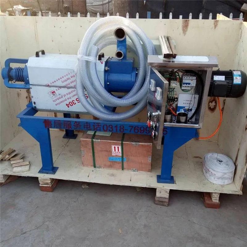 The solid-liquid separator use pump conveying the dung water to the host, the host spiral squeezing dung water under dynamic drive, pushed the dung water into the screen body, constantly push discharge port, the more material, the pressure is higher of the front end. With the increasing pressure of screen body, fibrous solid by screening out and push to discharge port, when the extrusion pressure is big enough, the liquid will be squeezed and separation from the solid, through the discharge outlet, the separated solid material would be squeezed and out from the discharge port.