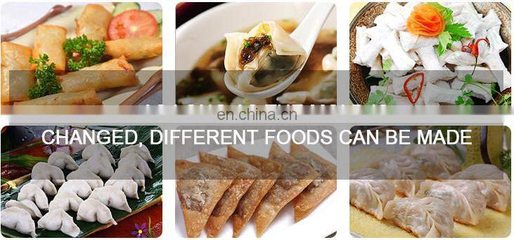 Automatic Dumpling Making Machine is suitable for producing all kinds of meat dumplings,vegetable dumplings, vegetable and meat mixed dumplings and so on. After replaced the head,it can also produce curry puff, pierogi, samosa, wonton, spring roll, pot sticker,etc. The products of the machine can be boiled, steamed, fried and frozen.