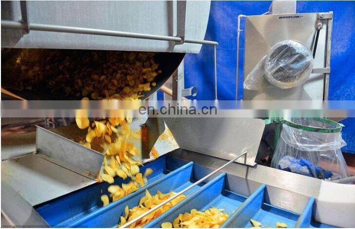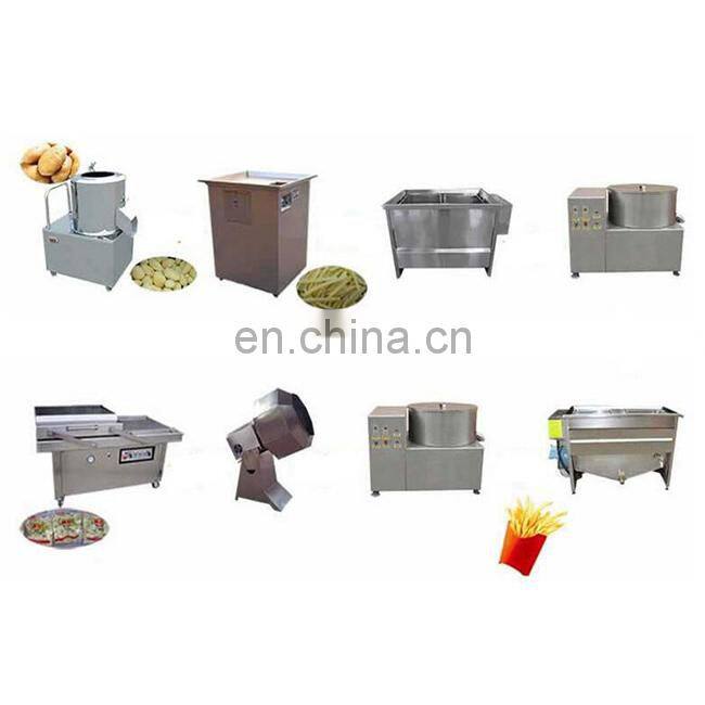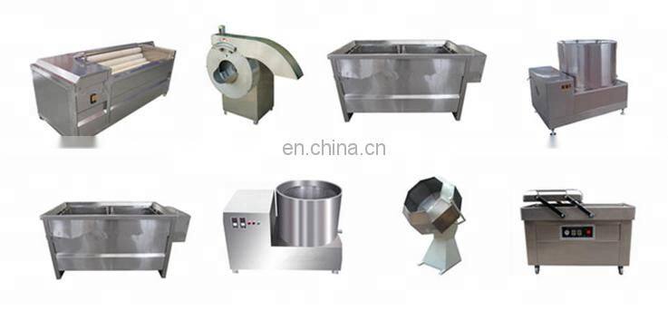 Fully automatic potato chips and chips production line absorbs the essence of similar equipment, retains the advantages of large equipment and condenses, and is designed and developed by referring to feedback information from users around the world. The utility model has the advantages of low one-time investment, low energy consumption, multiple functions, small volume, high profit, convenient use and maintenance, etc. The complete set of equipment consists of cleaning and peeling, slicing (strip), scalding, dehydration, oil-water mixed frying, deoiling, seasoning, packaging and auxiliary equipment.