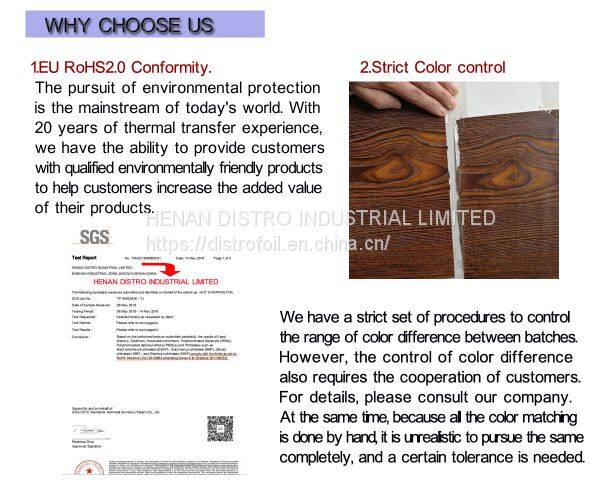 Heat transfer plastic foil is specifically formulated to use on plastic materials,like PVC,PS,ABS,UPVC,etc. Distro’s heat foil,can be made into Wood grain,marble,Metallic,antique and other custom appearance, according to different decoration demands.Meanwhile,after Topccoating,these printable foil can have excellent resistance to Scratch,abrasion, Sunshine,Water,Home detergent,general Chemical Solvent.