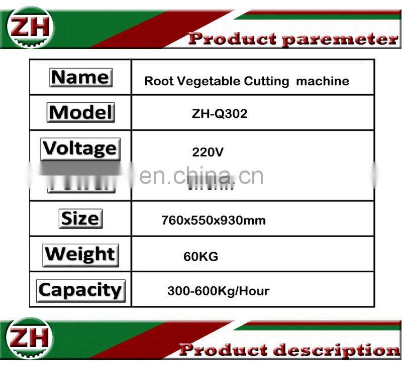 Vegetable cutting machine is good for root vegetable slicing, shredding and dicing. Such as potato, taro, sweet potato, onion, bamboo shoots, ginger, apple, carrot and papaya. You can have different size and shape by changed correspondence cutter.