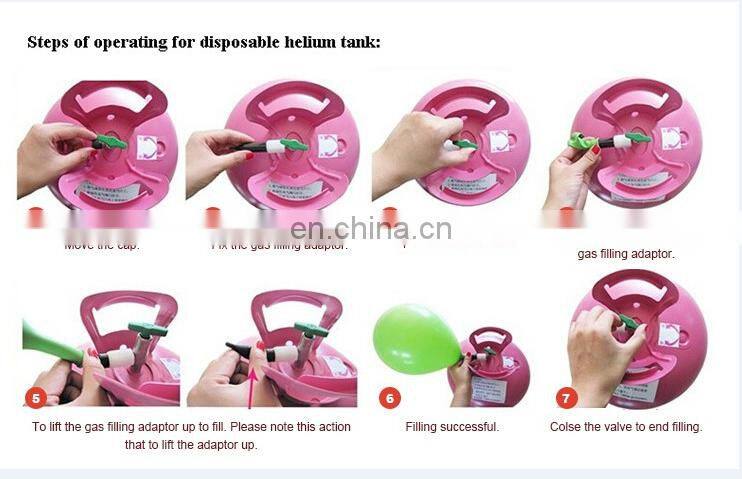 Disposable Helium Tanks/ Cylinder for filling different balloons and widely use for Wedding,Birthday Parties ,celebrations and so on .when you have it,you have a wonderful and relax time with high passion, This helium tank cylinders is safe,lightweight and easy to handle,even children can use it. The float time for each latext balloon is approxinmately 5-7 hours.
