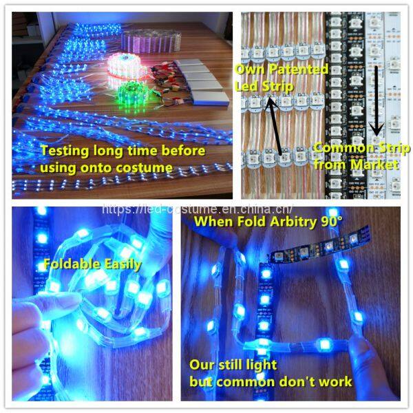 2) Our Fiber optic costumes use surface light emitting optical fiber, full color LED lamp as light source. It is not only can change color, also can be programmed. (This technique has been patented).