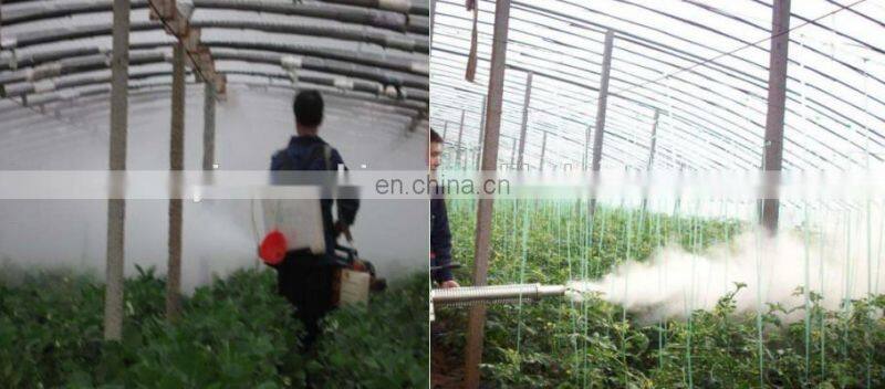 (4) reducing the temperature, increase production: Mist fog machine smoke very little water, spraying pesticides rainy weather as usual, does not affect crop growth.
