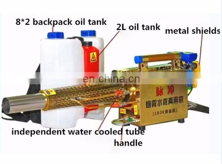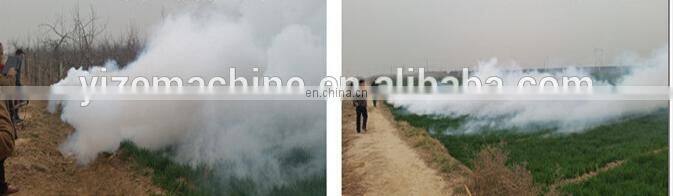 Due to the small particle size of drug efficacy . greatly reduces the pesticide inputs, less water .So to adapt to the areas where water shortage 2,Insecticidal sterilization rate is high 3.improve the temperature . In spring . When grain growing . After spring smoke can improve the earth surface temperature and To prevent frozen flowers . And can increasing both production and income 4,Spraying area is large and long . Spray the area is large, jet smoke can reach more than 50 meters .
