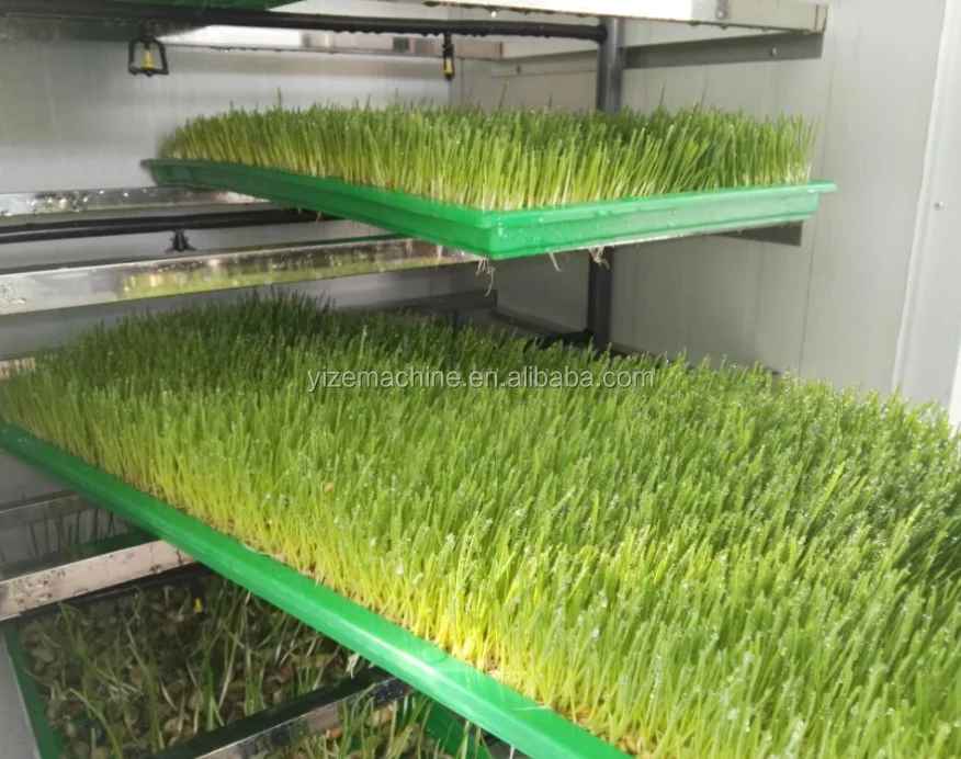 Hydroponics alfalfa fodder system for cow fresh feed with walk in passage refers to the fodder grown in a controlled environment using water but no soil is involved. it uses automatic temperature control and automatic watering system.People only need to put the seed into the plastic tray, it can automatic produce sprouts. 1 kg wheat seed can produce about 6 kg final sprouts.