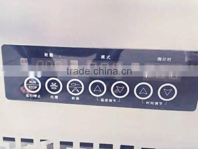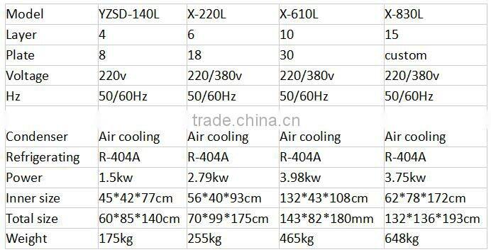3.Computer temperature delay protection, stable, fast cooling, removable door seal, freezing temperature ≥-30 ℃ and low temperature refrigeration cabinet interior even allow the cabinet temperature difference within the scope of national standards; standard conditions, the shrimp for example, the storage temperature ≤ + 25 degrees, about 40 minutes to complete frozen, core temperature is about -18 degrees .