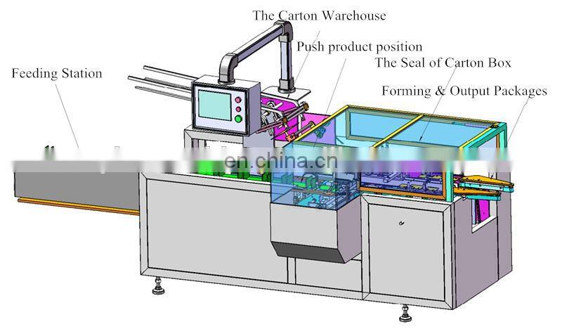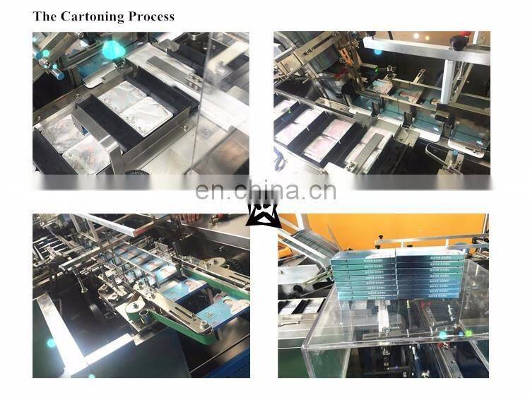 This product is suitable for the packing of soaps, daily chemicals, cosmetics, facial masks and similar articles. It can automatically complete the folding and folding of the instruction manual, the opening of the carton, the packing box of articles, the printing batch number and the sealing box at both ends of the carton.