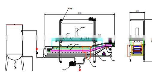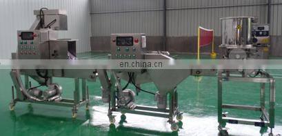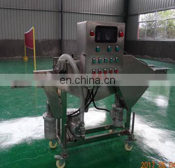 Meat Starching machine (dipping machine, stealth sizing machine) is through the product immersed in the slurry, so that the slurry evenly wrapped in chicken, meat pie and other products, apply to the top crumbs and powder before the process.The product is composed of upper and lower belt attached, fully wrapped completely immersed in the slurry in the upper and lower net. With adjustable distance. Even if the high viscosity of the slurry, can guarantee the smooth coated. By adjusting the fan control in the amount of products. Conveyor speed by frequency control, stepless speed regulation.