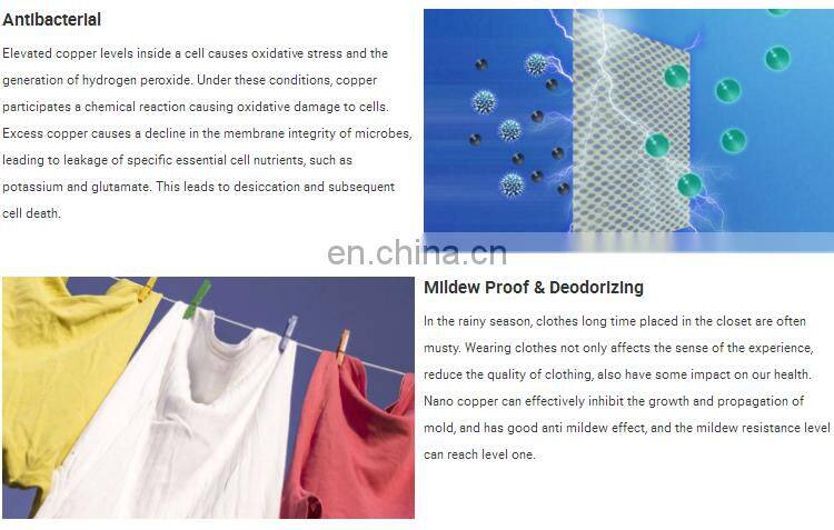 In our daily use of various textile products, such as underwear, sheets, bedding, insoles, socks, towels and so on, microorganism is able to grow on them and cause bacterial multiplication, which will affect our health. In view of this situation, the market has appeared a lot of antimicrobial textile products currently, including Nano copper as one effective antibacterial materials. It has gradually got people's recognition and acceptance and has become the new generation of textile consumption.