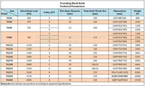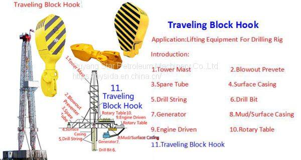 Traveling Blocks Hooks is an indispensable lifting equipment for drilling rigs,it can be used to lift swivel or top drive equipment. this product can be usd with a variety of different rigs to adapt to the needs of oilfield drilling.