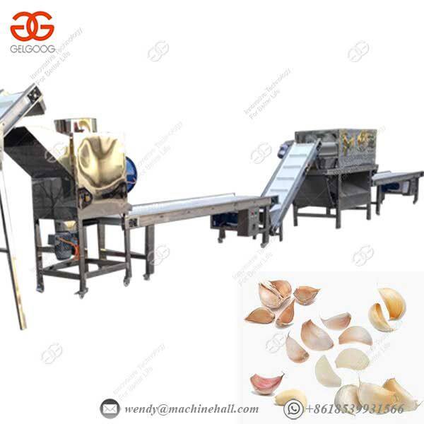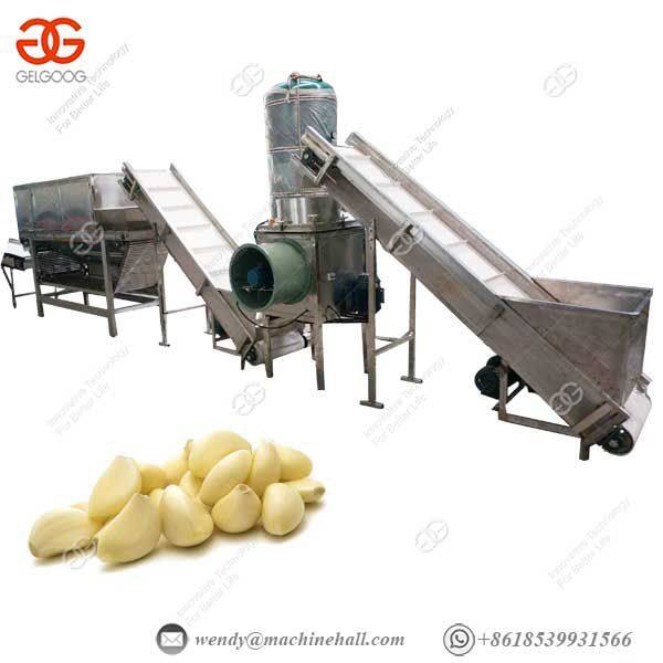 the garlic to the root is placed in the feeding hopper of the hoist, and the garlic is sent to the splitting machine by the grading machine with stepless speed regulation, and the garlic is evenly distributed after the splitting machine is divided. Passing, the peeling machine circulated by a specific pressure air, the garlic grain enters the selection zone, manually selects the unqualified garlic grain, and the qualified garlic grain enters the next process.