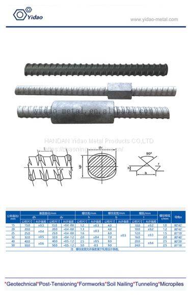 Thread bar Grand:HRB335/HRB500,PSB830/PSB930/PSB1080 (Grade :75/80/150/150FC/120FS) Diameter Range:M20/M25/M32/M36/M40/M50/M63.5