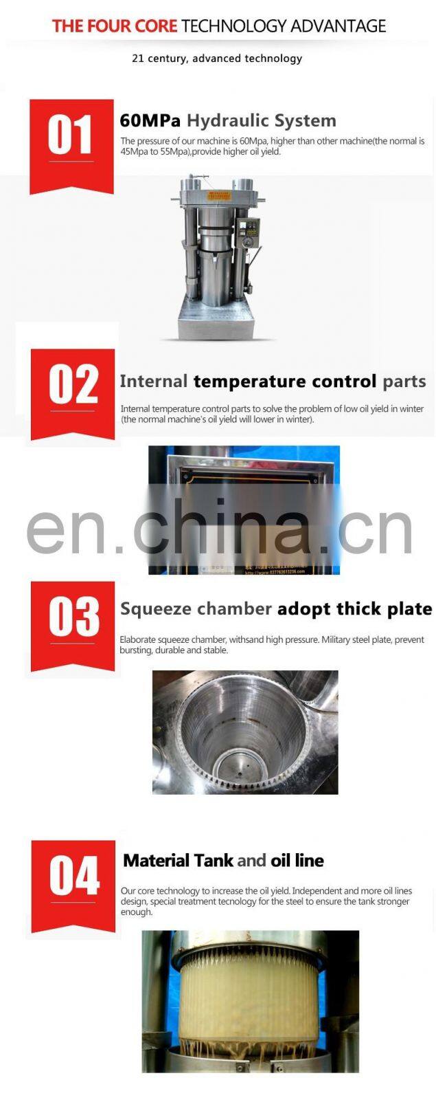 The hydraulic oil press machine is the most advanced equipment and takes up less area. Its material mainly electroplate. It is economic and environmental protection, stable and durable. This machine adopts automatic control system, hydraulic pressure control system and temperature control system. It has high pressure, high yield oil and easy to operate. This machine can work continuously for 24 hours. It can squeeze 4-23 kilogram per batch, the time of pressing is 4 to 15 minutes. The oil is pure and fragrant.