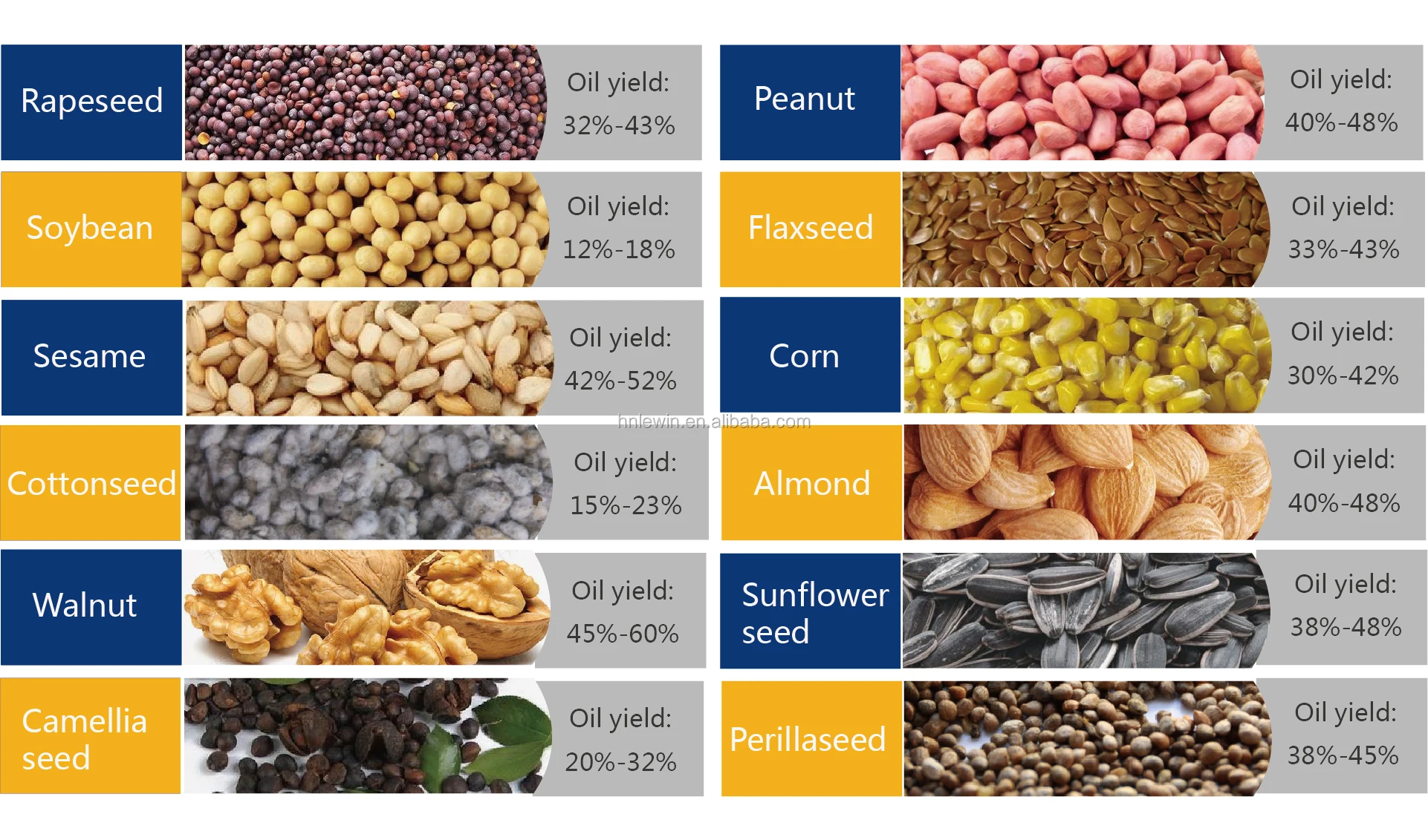 Our oil press machine can queeze many kinds of materials, such as rapeseed, peanut, soybean, flaxseed, sesame, corn, cottonseed, walnut, camellia, sunflower ect.