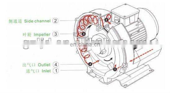 The gas it taken in through the inlet 1 .As it enters the side channel 2,the rotating impeller 3 imparts velocity to the gas in the direction of rotation.Centrifugal force in the impeller blades accelerates the gas outward and the pressure increase.Everyrotation adds kinetic energy.resulting in the further increase of the pressure along the side channel.The side channel narrow at the rotor,sweeping the gas off the impeller blades and dis-charging it through the outlet silencer 4 where it exits the side channel blower.