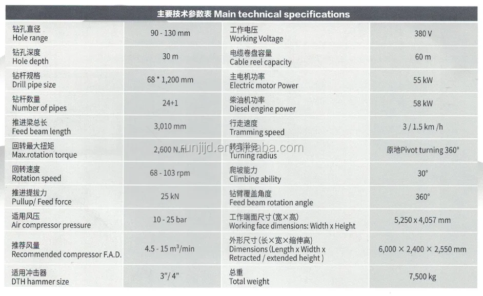 4.With diesel &electric dual power packs, diesel engine for tramming, with fast/slow dual speeds. Electric motor for drilling, energy saving &low noise.