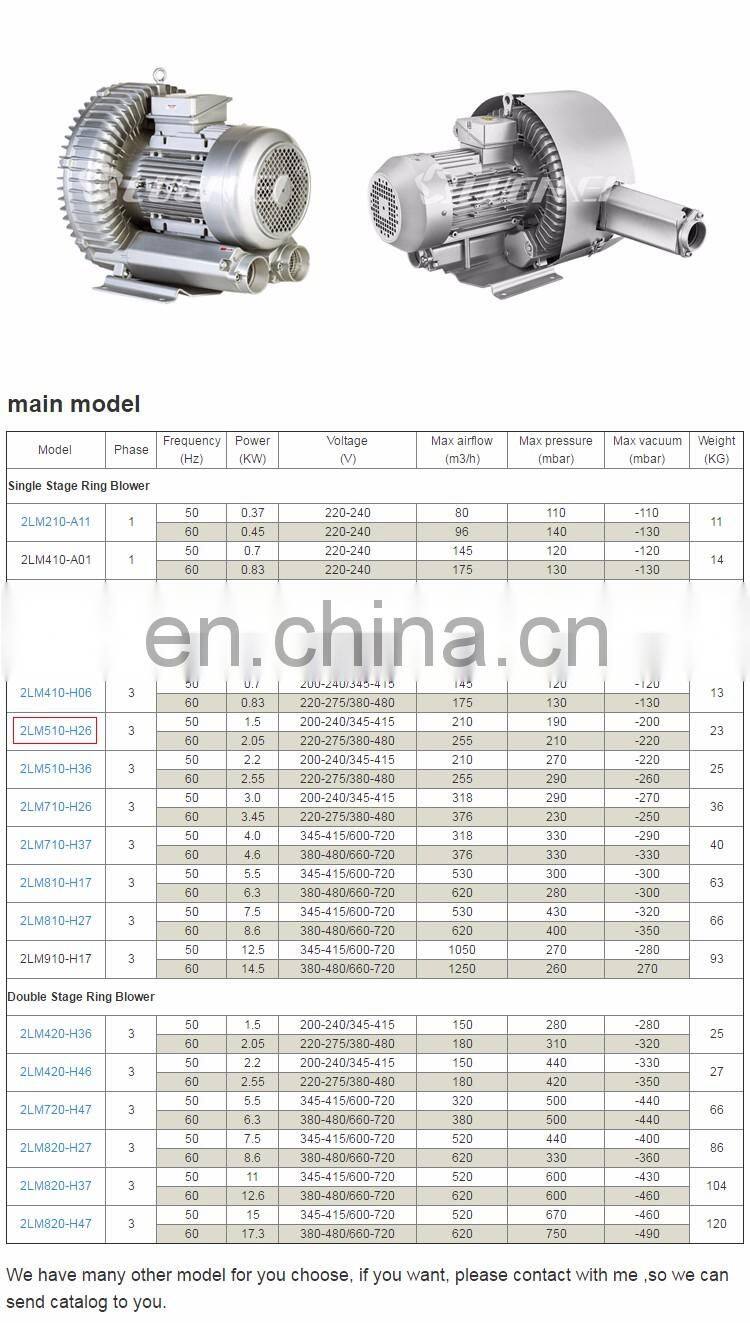 To be used in Pneumatic conveying systems. Vacuum lifting systems. Fish and shrimp pond oxygen supply. Wastewater treatment and electroplating pool aeration. Packing and printing machines. Bottle drying system with air knife. Dental vacuum suction machine and medical equipments. Textile machines.Smoke extraction in industry or kitchen. Food processing drying . Vegetable washing machine.Industry vacuum clenaer. Soil remediation