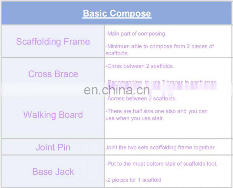 Frames are erected vertically and simply by coupling pin. No special skill or special tools. The assembling is accomplished with ease and speed. Its labour saving.