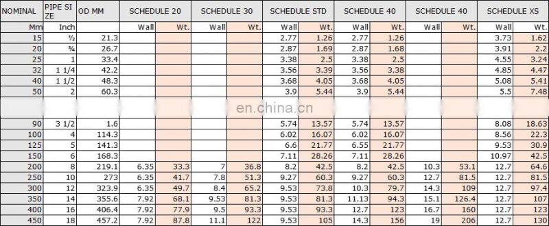 ASTM PIPE SCHEDULE: Wall Thickness in MM, Wt = Weight in Kg. / Mtr.