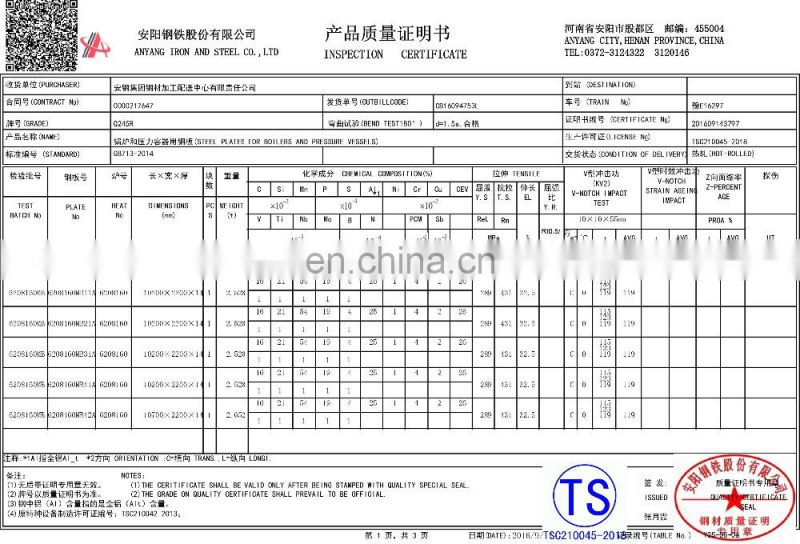 2.Grade: A387 Gr.12/22,Q275R,Q345R, A515GR60/70,A516GR60/GR70 and so on.