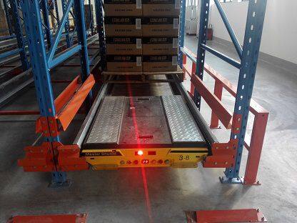 When Picking, the shuttle carries pallets from deep side to the front side of racking, the pallets are to be picked from the racking by forklift.
