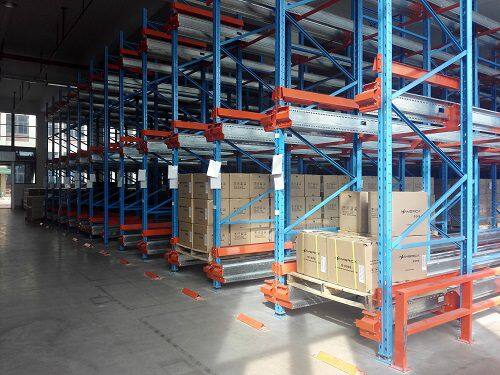 Time saving and safe. Forklifts just take the pallets at the front of racking. No need to enter into aisles.