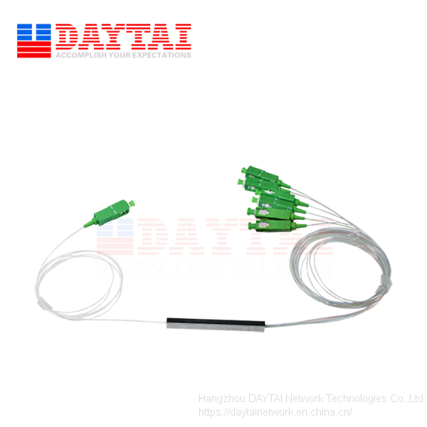 1 x 6 PLC Splitter Mini type,SM fiber,fiber optic cable OD:0.9mm pigtail,1m length, with SC/APC connector.
