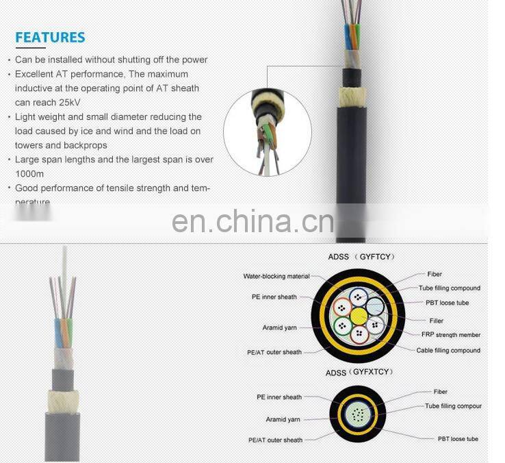 ADSS cable is loose tube stranded. Fibers, 250μm , are positioned into a loose tube made of high modulus plastics. The tubes are filled with a water-resistant filling compound. The tubes (and fillers) are stranded around a FRP (Fiber Reinforced Plastic) as a non-metallic central strength member into a compact and circular cable core. After the cable core is filled with filling compound. it is covered with thin PE (polyethylene) inner sheath. After stranded layer of aramid yarns are applied over the inner sheath as strength member, the cable is completed with PE or AT (anti-tracking) outer sheath.