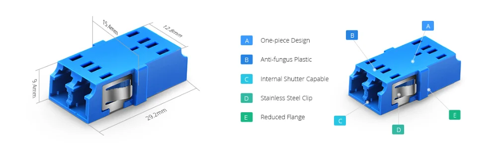 The fiber optic adapter is loaded with corresponding dust cap to prevent it from dust and keep it clean.