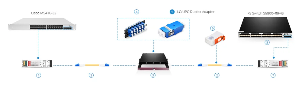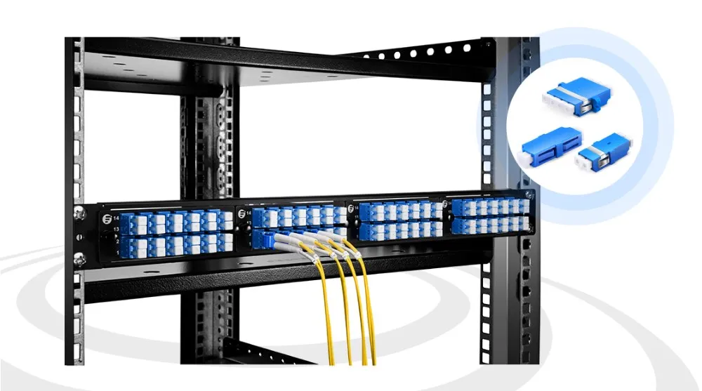 Fiber optic adapter is a small device designed to terminate or link the fiber optic cables or fiber optic connectors between two fiber optic lines, which has the merits of low insertion loss, good interchangeability and reproducibility. The following figure shows LC/UPC adapter used together with fiber adapter panel and fiber enclosure in data center solutions.