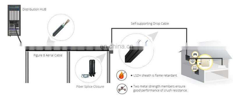 The typical GJYXFCH/GJYXCH self-supporting butterfly drop optical cable consists of GJXFH/GJXH cable and an additional strength member. It's applicable in outdoor communications. LSZH sheath is extruded outside for indoor application.
