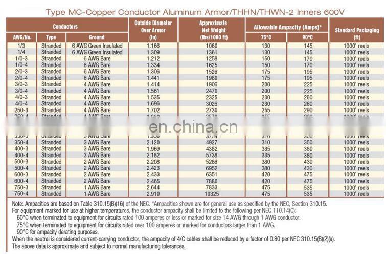 High Standard 600 Volt UL Type XLPE Insulation Aluminum Armored Copper Conductors MC Cable in China