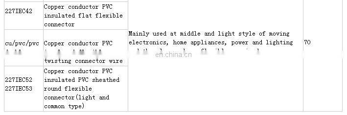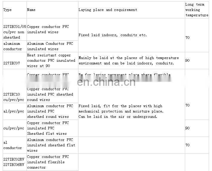 This products is fit for rated voltage U0/U 300/500V and 450/750V for domestic electrical applicants of smaller size motoriace tools of instruments of various meters and motorized lighting installations.