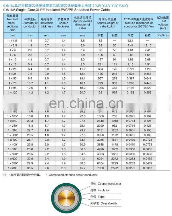 YJV | Copper conductor, XLPE insulated,PVC sheathed power cable | For laying indoors,in tunnel or cable trench,unable to bear exter nal mechanical forces.Single core cable is not allowed to laid in magnetic duct. | |