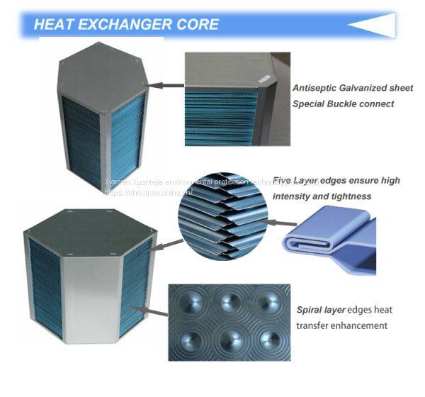 Cross flow heat exchanger core is made of antiseptic hydrophilic/epoxy coating aluminum foil and galvanized sheet cover. The air is forced to crossover through the heat exchanger core, two airstreams never come into direct contact, avoid the transfer of any smell and moisture. It is usually being used for recovering energy at residential, commercial and wind -power industry ventilation systems.