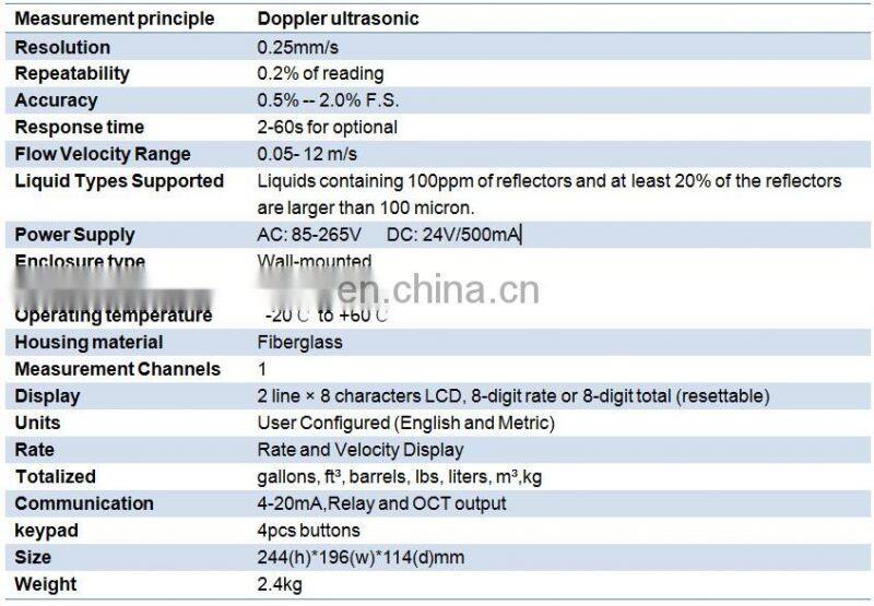 The Doppler ultrasonic flow meter can display flow rate and flow totalizer, etc., and is configured with 4-20mA, OCT outputs