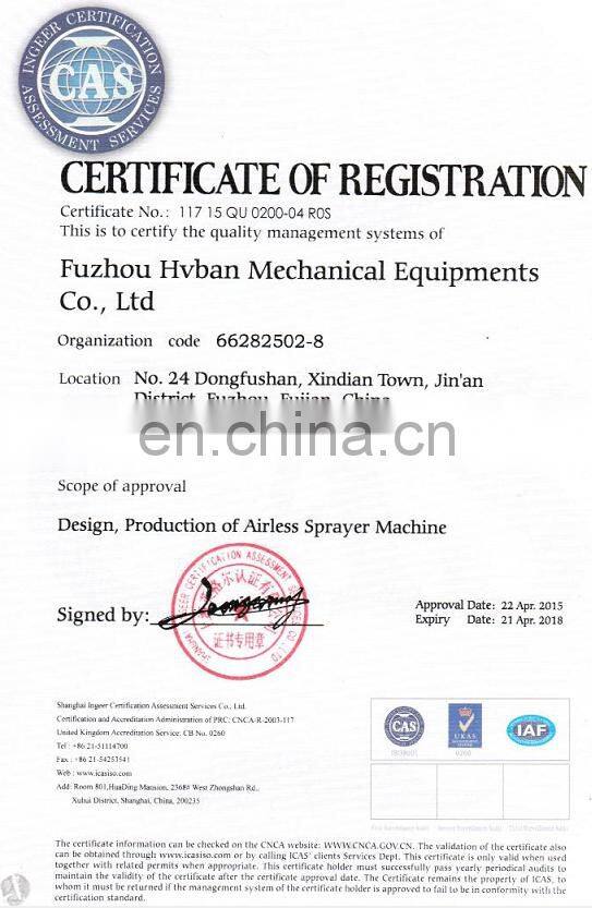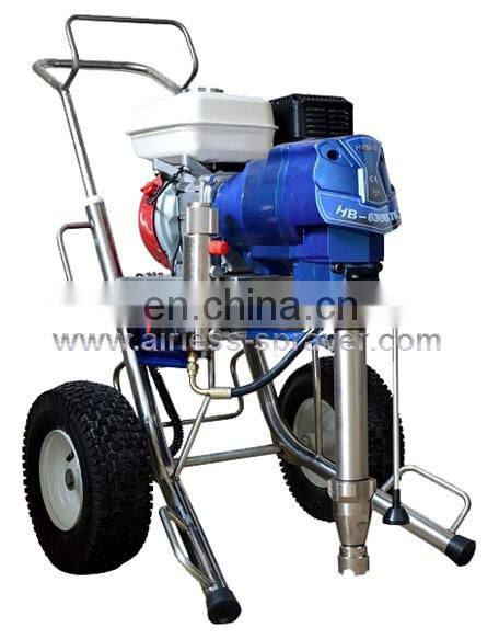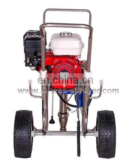 This item is very powerful machine for professional contractors who spray a wide variety of coatings on residential, commercial, and industrial jobs. It is equipped with famous quality HONDA engine, Germany INA bearings, same clutch as Graco and Watchdog etc. It can finish spraying without space limit and voltage limit. The long piston and low position of the inlet valve generates the suction power for high viscosity materials.