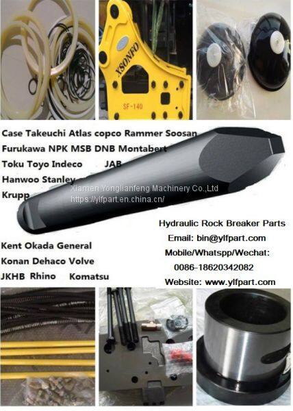 We(Xiamen Yonglianfeng Machimery Co.,Ltd) are manufacturer of Hydraulic breakers/hammers and Replacement spare parts for hydraulic hammers of Soosan,Hanwoo,NPK,Toyo,Furukawa,montabert,rammer,atlas copco,MSB etc., the Hydraulic breaker parts We have are: front head, back head,cylinder,chisel tool, seal kits,piston, diaphragm, thrust bush,ring bush,front cover,rod pin/chisel pin,stop pin,accumulator, through bolt,side bolt, bracket, upper cushion,lower cushion,damper etc.