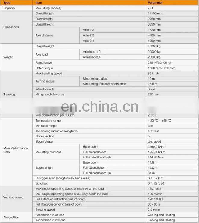 The 75 ton truck crane has five-section boom of high strength steel structure and optimized U-shaped cross section with max.lifting capacity of 75t, full-extended boom length of 45m, jib length of 16m, max.lifting height including jib of 61m, reduce weight and improve safety significantly.