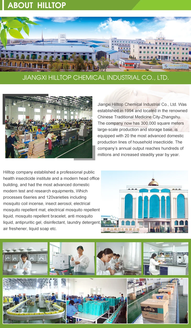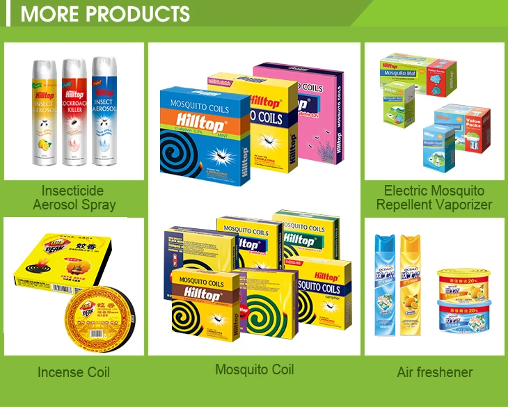 | Hilltop Brand Tiny Smoke Mosquito Coil is made of the high quality original drug of synthetic pyrethrin. The coil is harmless to human body and livestock while knocking down and killing mosquito rapidly with possessing fragrant smell. It can make air pure and fresh. Each coil burns for 12hours with superior quality.