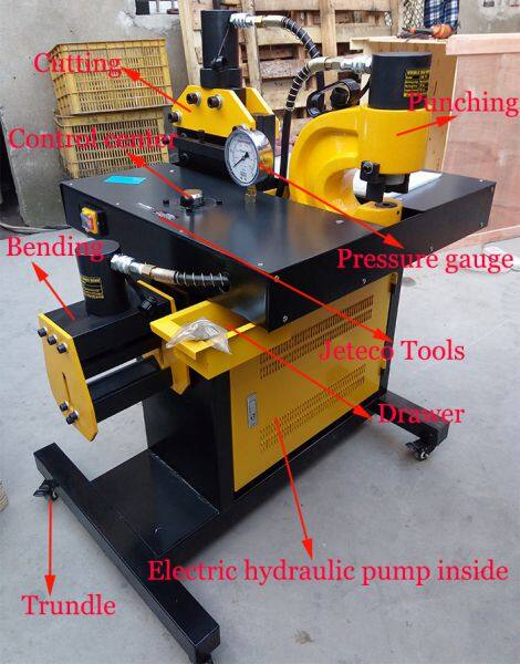 Multi-function hydraulic busbar processor machine jeteco tools brand, working for hole punching, cutting and bending.