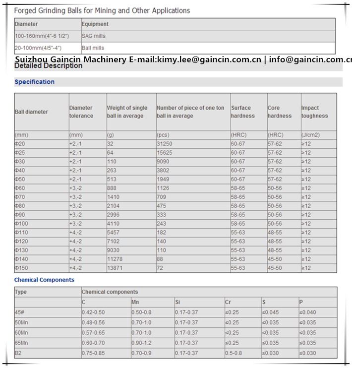 Grinding Media Mill Steel Balls in the technical specifications from Suizhou Gaincin Machinery