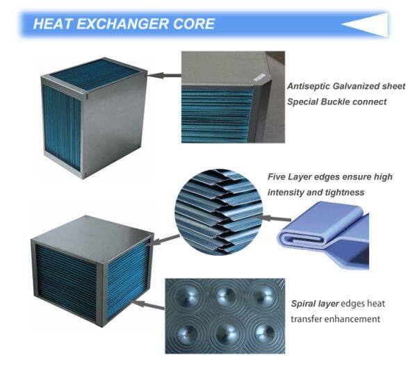 Cross flow heat exchanger core is made of antiseptic hydrophilic/epoxy coating aluminum foil and galvanized sheet cover. The air is forced to crossover through the heat exchanger core, two airstreams never come into direct contact, avoid the transfer of any smell and moisture. It is usually being used for recovering energy at residential, commercial and wind -power industry ventilation systems.