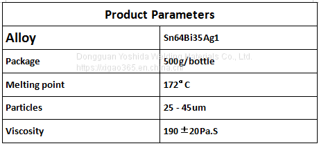 No-clean lead-free solder paste, high-reliability flux with good wettability and good solderability, and lead-free alloy powder of high sphericity and low oxygen content of Sn64Ag1Bi35, scientifically prepared. It can meet the needs of lead-free medium temperature solder joints. It is an ideal environmentally friendly no-clean lead-free solder paste for use with lead-free soldering processes.