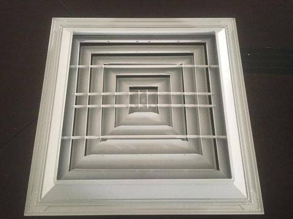 * Square ceiling diffuser is an integrated design ,where the diffuser frame is punched and stamped in one piece with the diffuser core. The diffuser is designed to deliver air equally in all 4 directions .